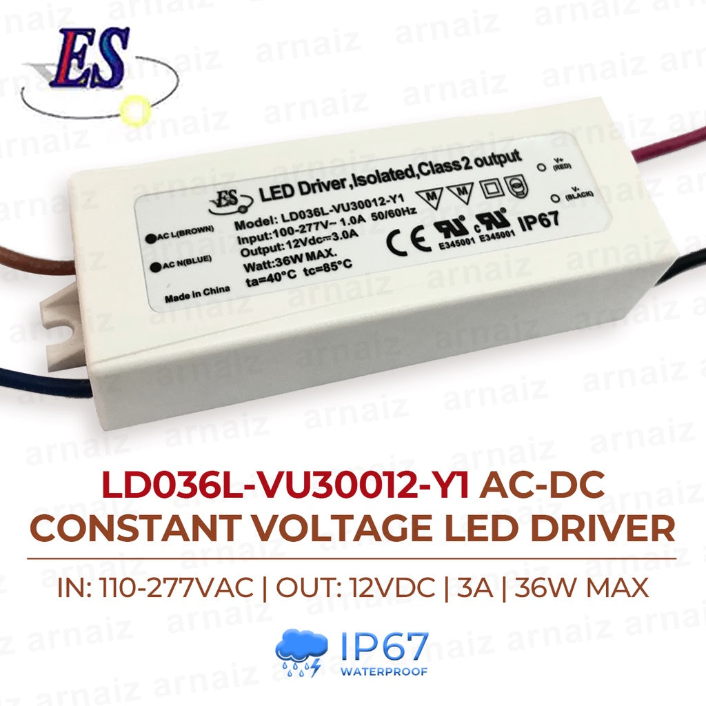 ES LD036L-VU30012-Y1 AC-DC Constant Voltage LED Driver IP67 IN:110-277VAC OUT:12VDC, 3A 36W Max 36Watts