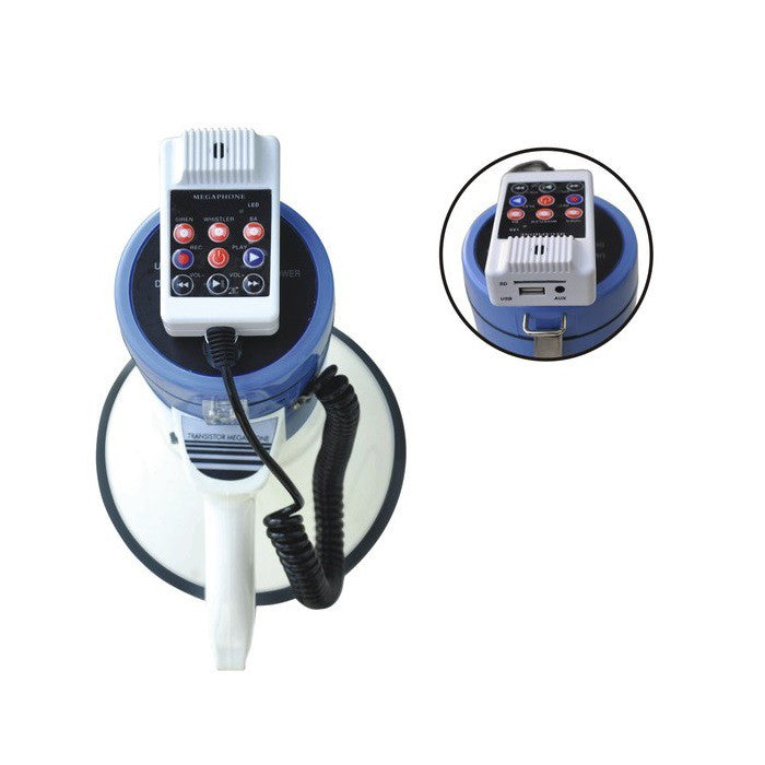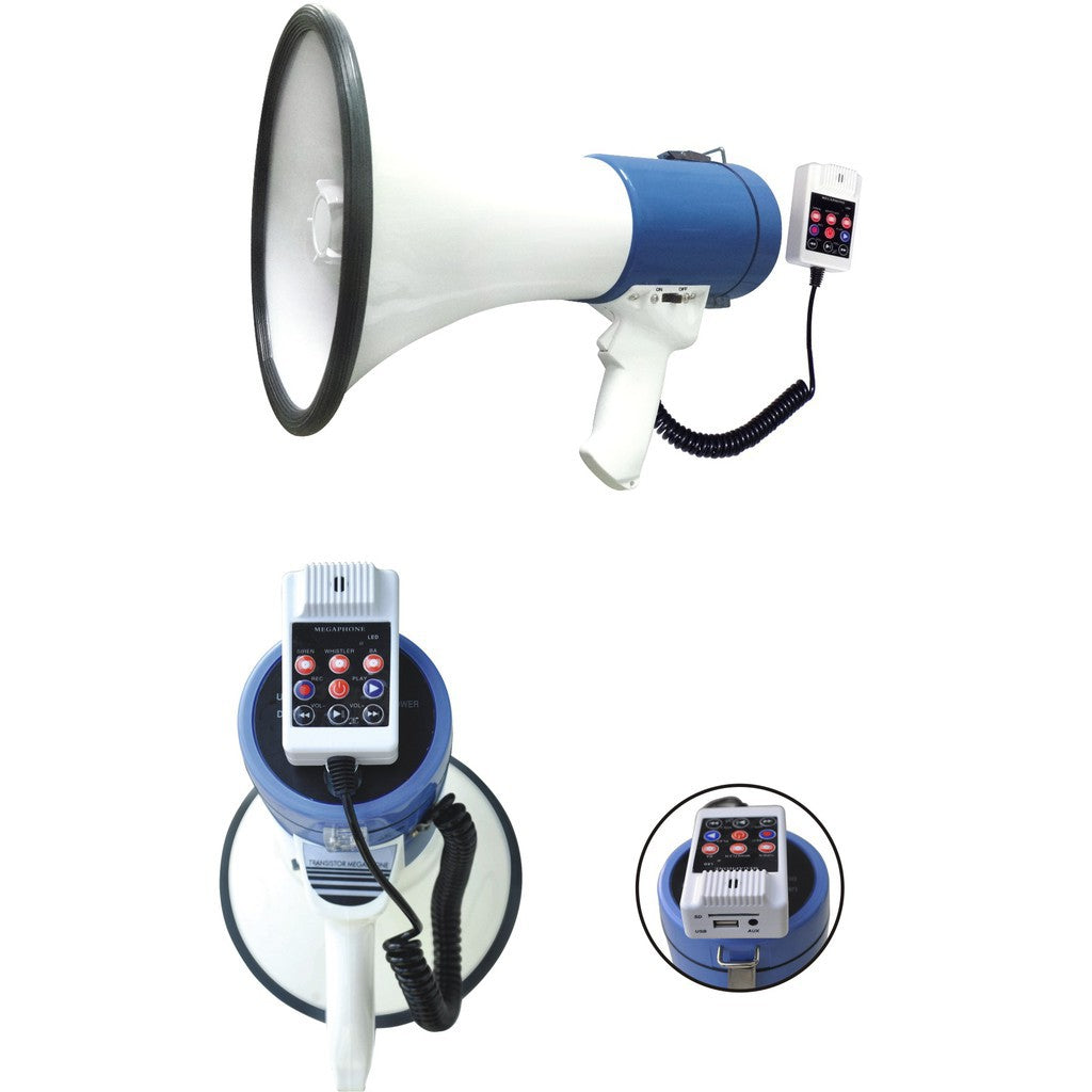 Megaphone 50W Rechargeable Portable Global’s MU-8R Talk, Siren, USB, SD and Recording White Blue HD