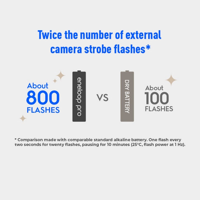 High Capacity for High-Drain Devices. Photo strobe flashlight equipped with Eneloop pro can provide more than twice the number of flashes (about 800) per recharge in less than half the time (only 3.3s) as compared to conventional alkaline batteries.