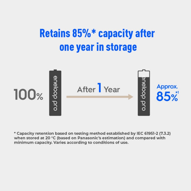 While other non-ready-to-use rechargeable batteries lose their charge overtime, PANASONIC's eneloop pro technology enables these batteries to keep 85% of their charge up to 1 years.
