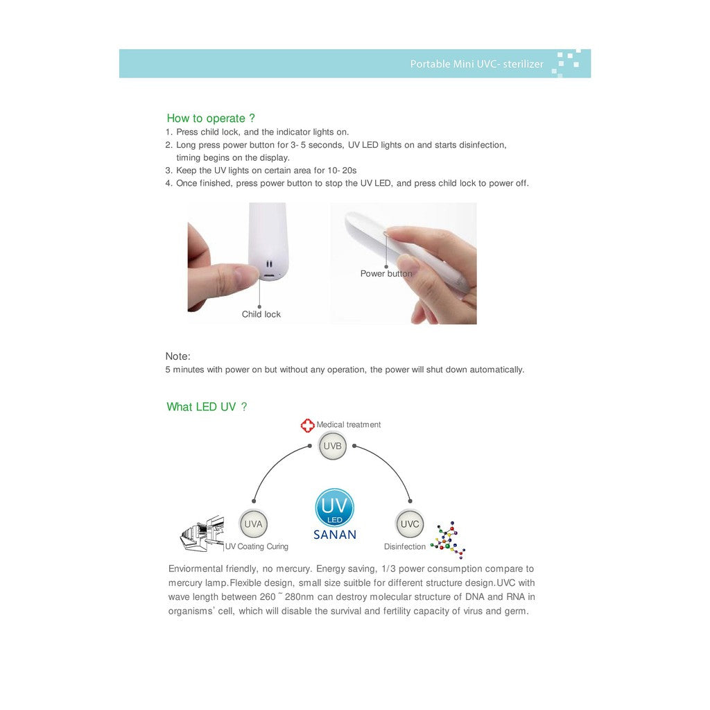 Features1. 99.99% sterilization rate in 20 seconds.2. Standard USB charging interface.3. Child lock for Safety.4. Purple visible light LED mounted with UVC LED to indicate UVC radiation area5. Min shape design, portable.